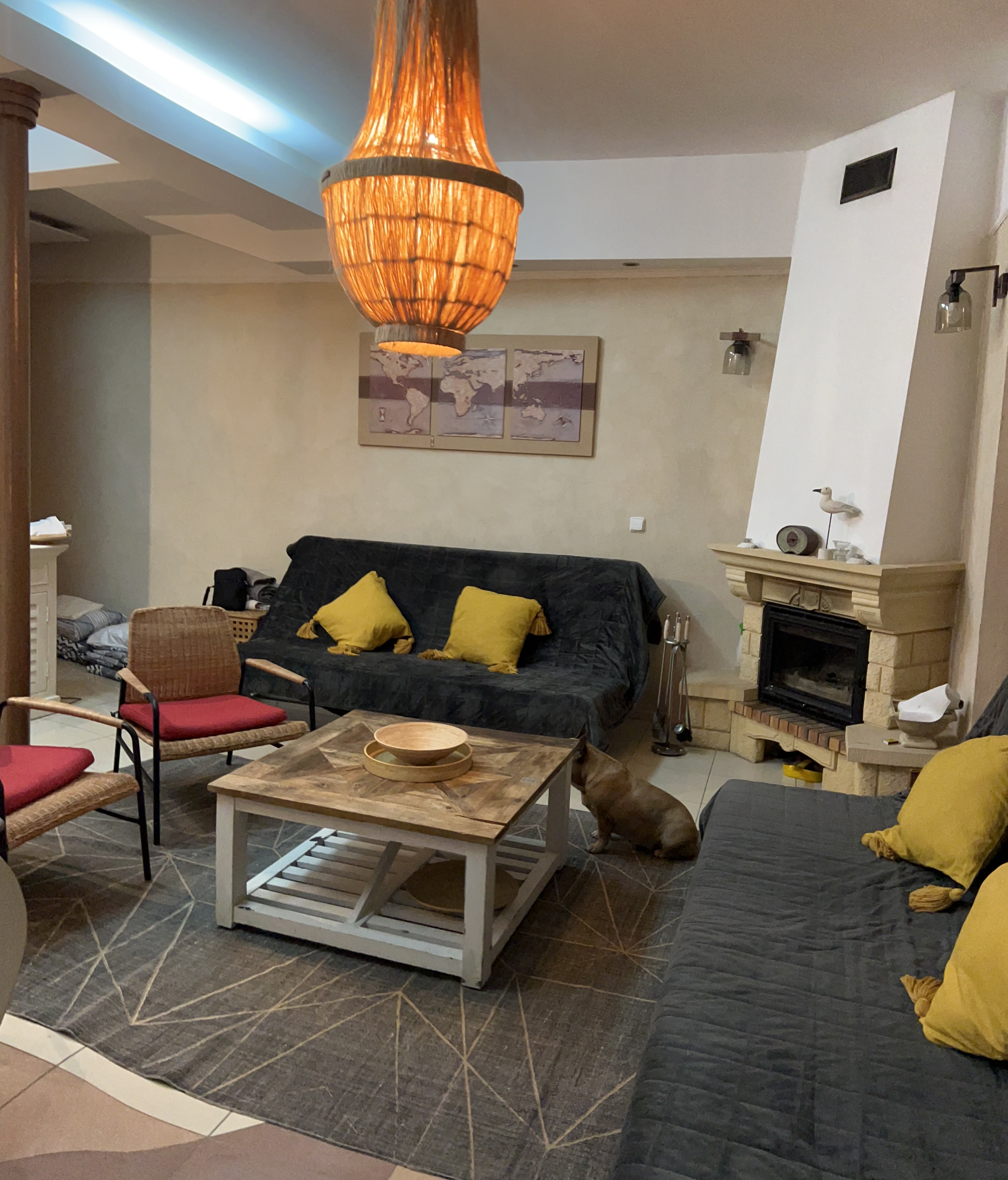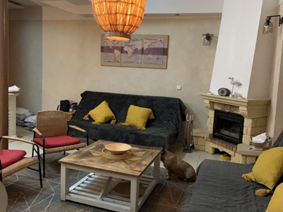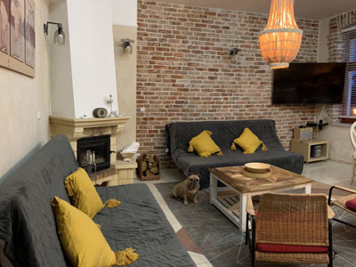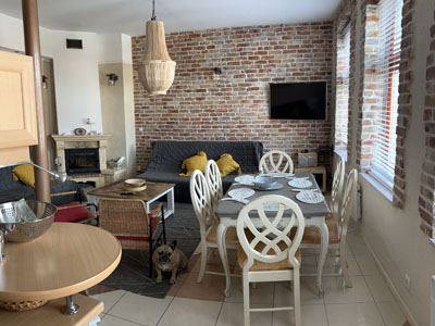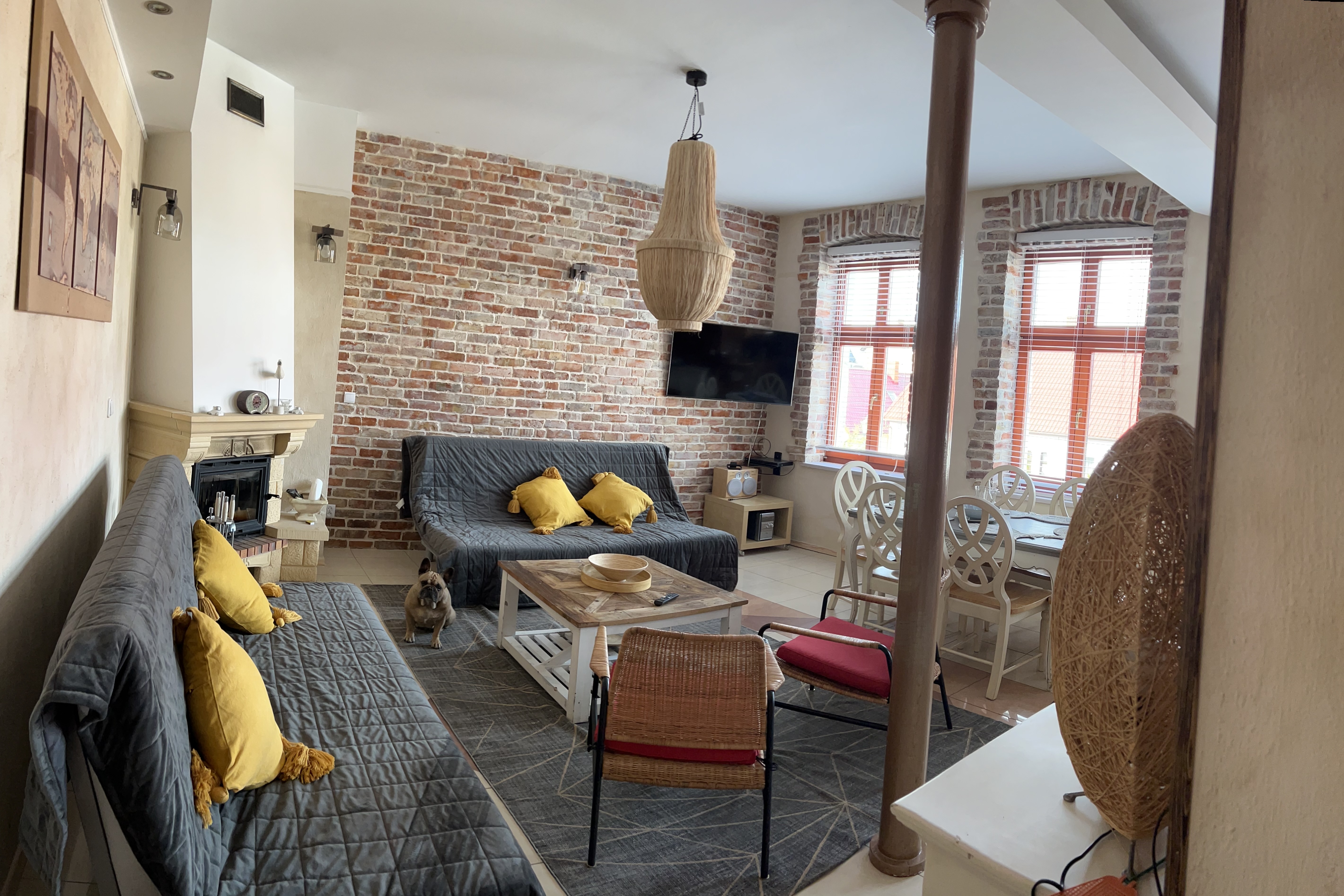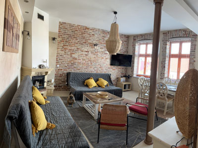 TV LCD, DVD, wieża, kominek, dwie sofy rozkładane dla dwóch osób, lodówka, pralka, zmywarka, ekspres do kawy, mikrofalówka, kuchenka elektryczna z piekarnikiem